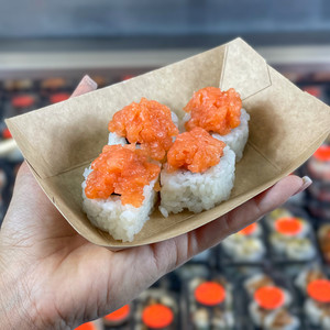 gunkan con salmone, gambero argentino e tobiko. Non si può personalizzare.